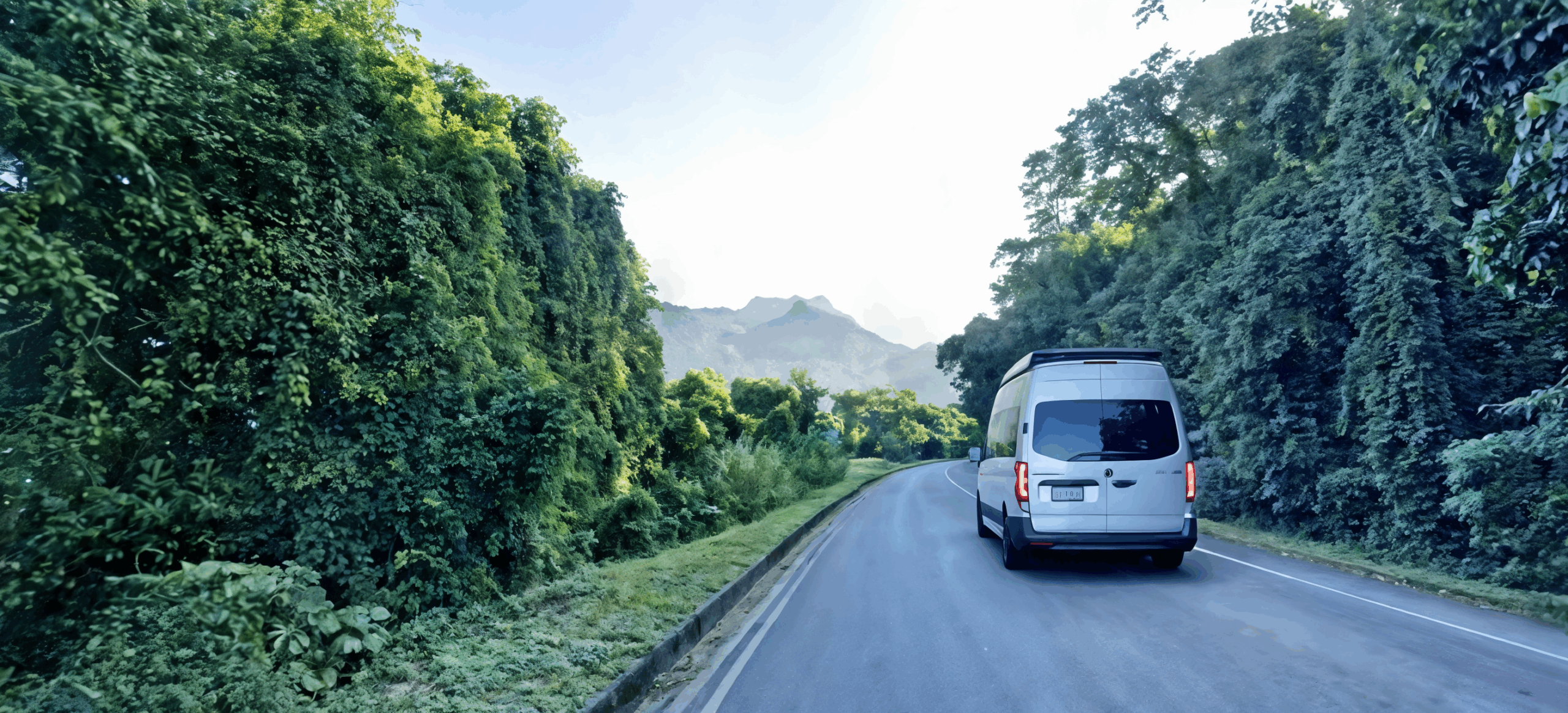 En varevogn kører langs vejen mellem Ilha Grande og Rio de Janeiro, omgivet af frodige grønne landskaber, snoede stier og en betagende udsigt over Brasiliens naturlige skønhed.
